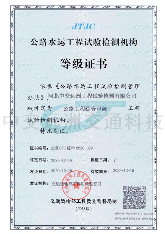 12月16日,交通運輸部傳來喜訊:檢測公司順利通過公路工程綜合甲級(以下簡稱綜甲)試驗檢測資質評審,取得綜甲證書。