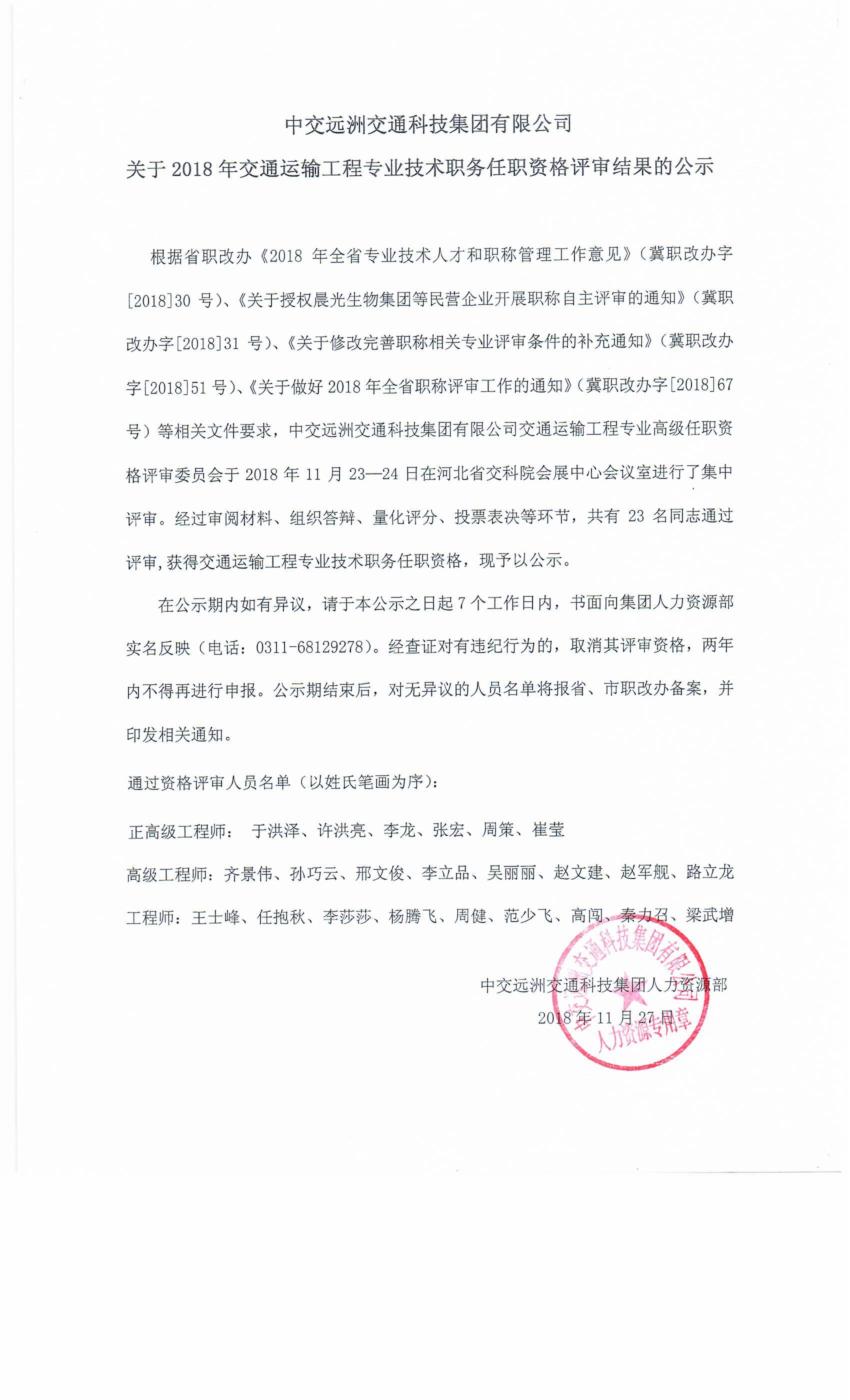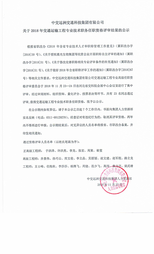 關於2018年交通運輸工程專業技術職務任職資格評審結果的公示