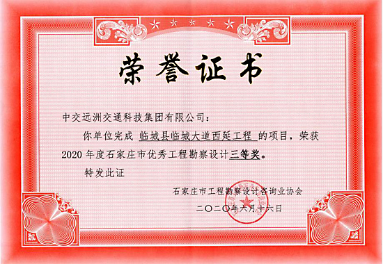 臨城縣臨城大道西延工程的項目榮獲2020年度石家莊市優秀工程勘察設計三等獎