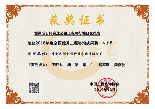 《湄潭至石阡高速公路工程可行性研究報告》榮獲2018年度全國優秀工程谘詢成果三等獎
