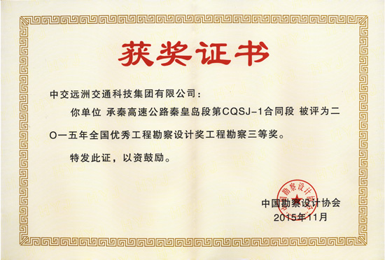 《承秦高速公路秦皇島第CQSJ-1合同段》獲全國優秀工程勘察設計獎工程勘察三等獎