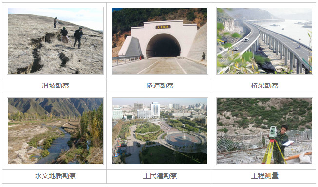 ①公路勘察 ②溶洞勘察 ③邊坡勘察 ④水上勘察 ⑤工民建勘察 ⑥采空區勘察