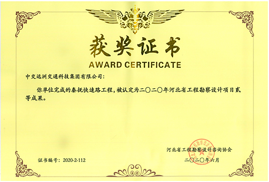 秦撫快速路工程被認定為2020年河北省工程勘察設計項目貳等成果