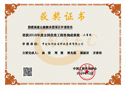 《邯港高速公路衡水段項目申請報告》榮獲2018年度全國優秀工程谘詢成果三等獎