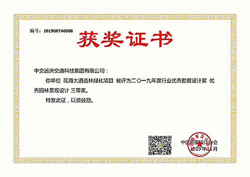 花海大道造林綠化項目被評為二〇一九年度行業優秀勘察設計獎、優秀園林景觀設計三等獎