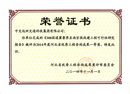 《308國道冀魯界至南宮段改建工程可行性研究報告》獲優秀工程谘詢成果一等獎